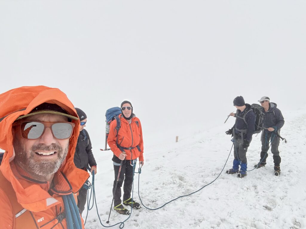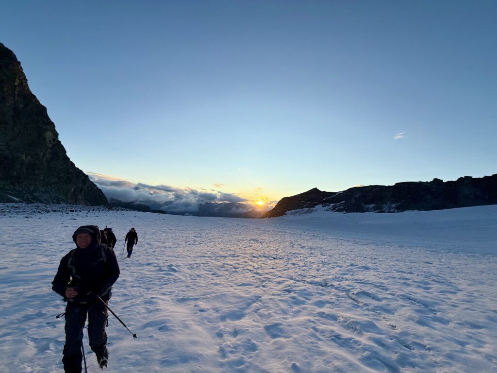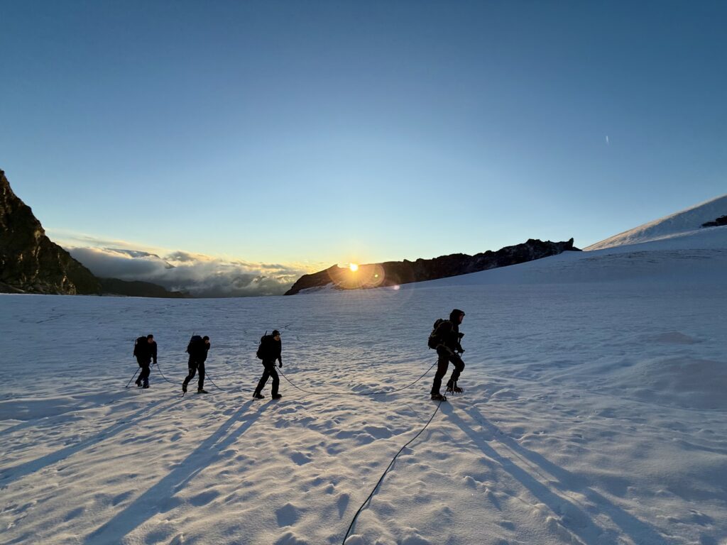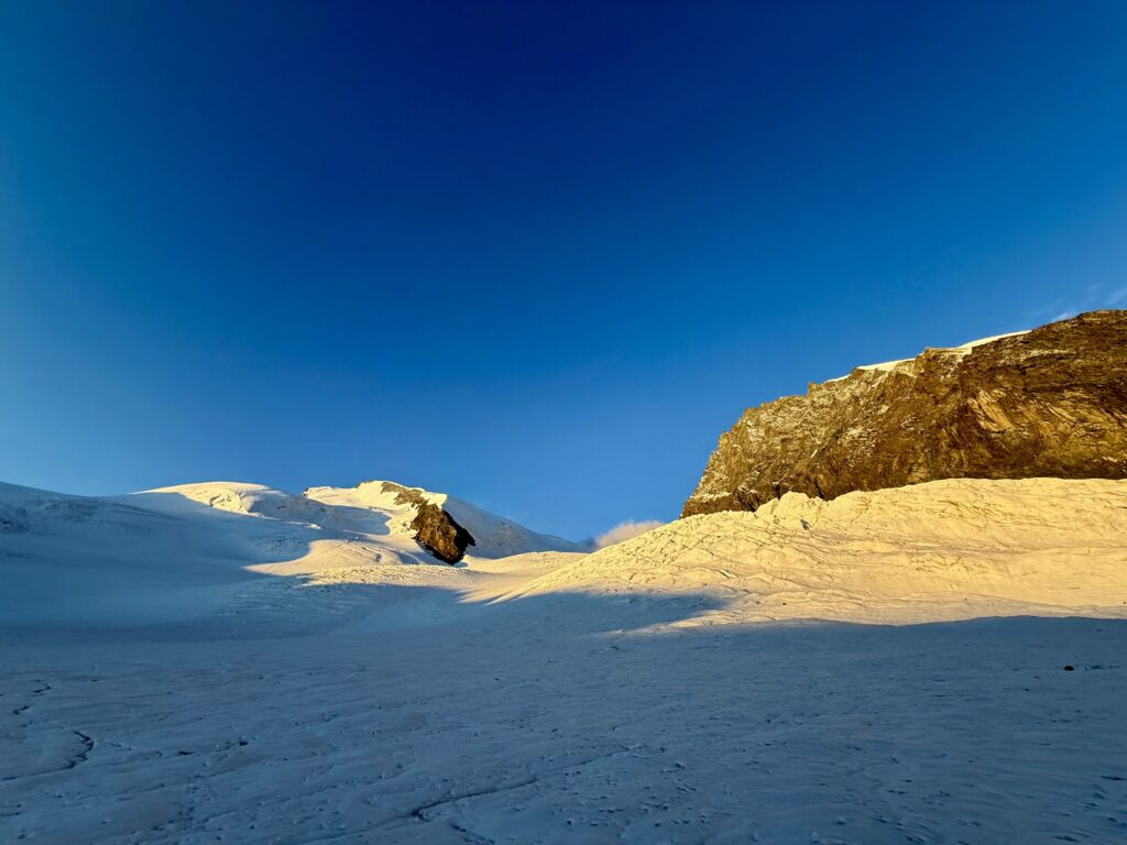 Die Nacht ist kurz. Um 04:00 Uhr Frühstück, um 04:45 Uhr geht’s los. Stirnlampen an, Seile bereit – und Schritt für Schritt steigen wir über den Gletscher dem Ziel entgegen. Die Bedingungen sind hervorragend: fester Schnee, gefrorene Stellen, dort wo man sie will.