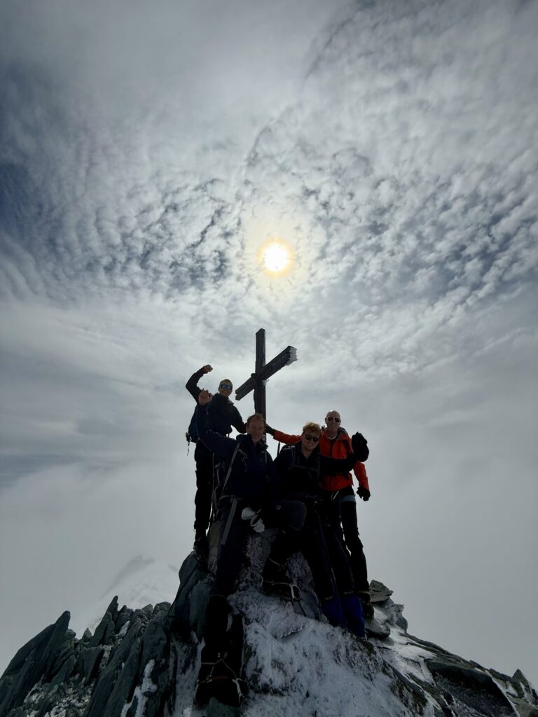 Von dort starten wir im dichten Nebel. Das Wetter ist ungemütlich, die Sicht eingeschränkt. Zwischen Spalten hindurch bahnen wir uns vorsichtig den Weg. Schritt für Schritt geht es höher, und mit der Höhe bessert sich auch das Wetter. Plötzlich tauchen wir aus der Wolkendecke heraus – vor uns eine klare Sicht, Sonne und die umliegenden Gipfel. Ein magischer Moment! Kurze Zeit später stehen wir gemeinsam auf dem Allalinhorn – der erste Erfolg ist geschafft.