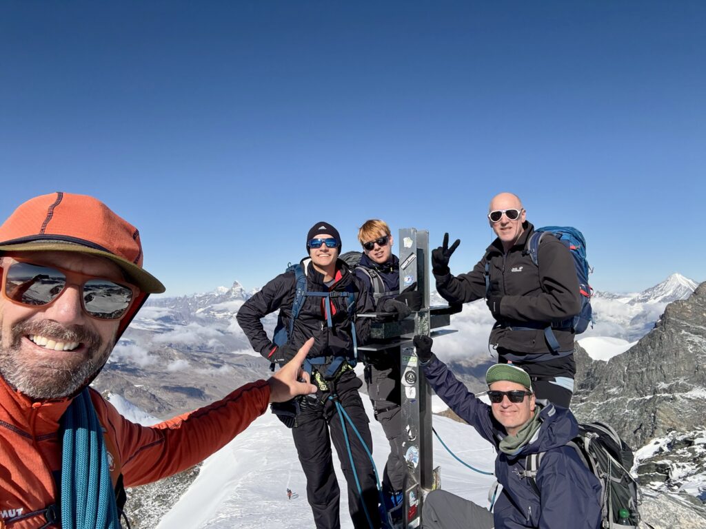 Nach rund fünf Stunden erreichen wir den Gipfel des Strahlhorns – eine tolle Zeit. Oben ist es kalt, deshalb halten wir die Gipfelrast kurz, geniessen aber den Moment.